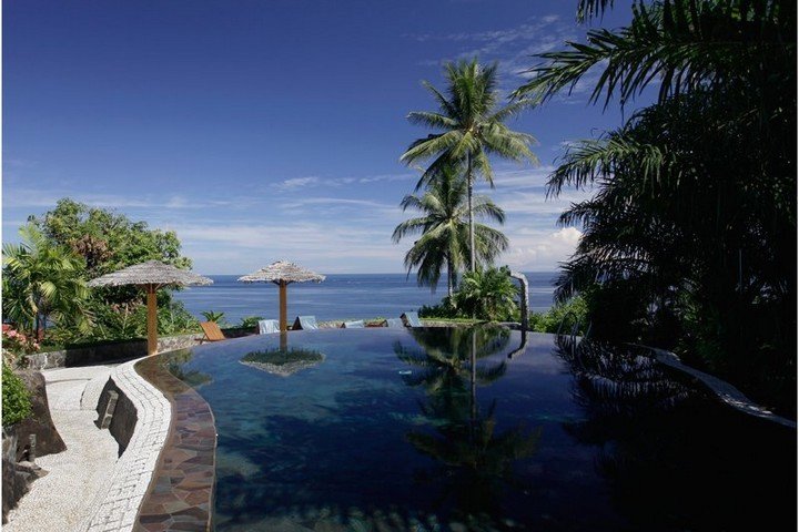 Lumba Lumba Diving Manado heeft ook een heel mooi zwembad. Het ligt tegen de helling op ongeveer 40 meter boven zeeniveau. De ligging, het gebruik van natuurlijke materialen en het water dat over de rand loopt geeft het zwembad een oneindig effect. Ook vanuit het zwembad geniet je weer van het prachtige uitzicht.